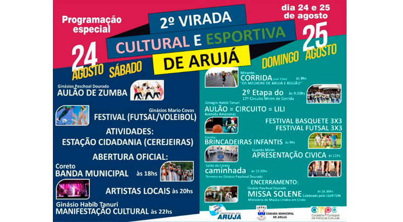 Foi divulgada a programação oficial da 2ª Virada Cultural e Esportiva de Arujá. O evento ocorrerá nos dias 24 e 25 de agosto com realização das Secretarias Municipais de Cultura e Turismo e de Esportes e Lazer, da Câmara de vereadores e do Conselho Municipal de Políticas Culturais.