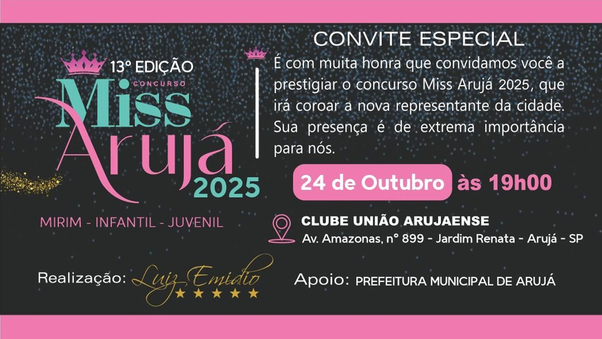 O concurso Miss Arujá Infantojuvenil chega na cidade com a sua 13ª edição! O evento acontecerá no dia 24 de outubro no Clube União, localizado na Avenida Amazonas, 899, no Jardim Renata. Organizado por Luiz Emídio e com apoio da Prefeitura de Arujá, por meio da Secretaria Municipal de Cultura, o início está previsto para às 19 horas e celebrará uma noite repleta de carisma e emoção, tornando-se uma oportunidade pessoal e artística para os jovens talentos de Arujá.