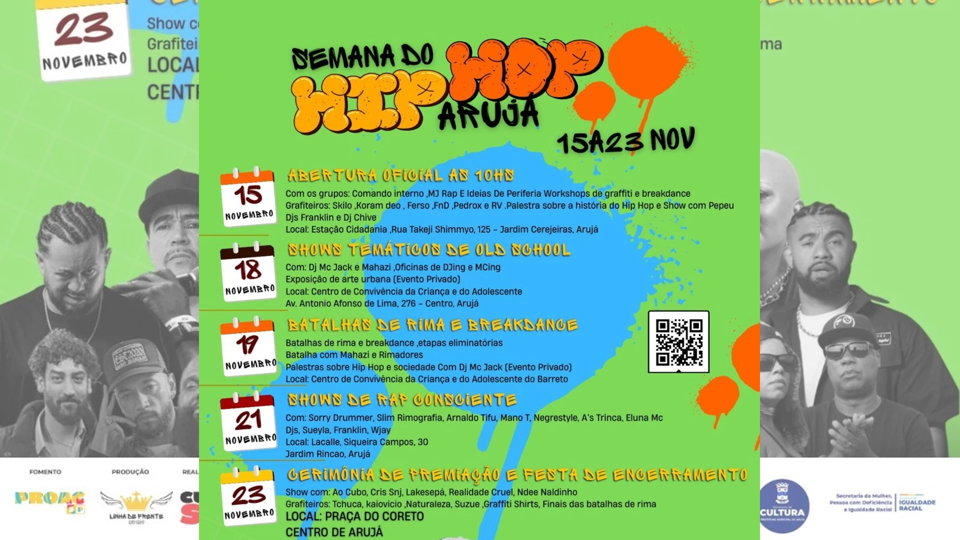 Cabe ressaltar que a Semana do Hip Hop Arujá é uma realização do Programa de Ação Cultural (PROAC), do Governo do Estado de São Paulo, no qual o DJ Wjay foi contemplado, reafirmando o compromisso do programa com o fomento à cultura e à valorização da arte da população. O evento conta ainda com o apoio da Prefeitura de Arujá, por meio da Secretaria Municipal de Cultura, do Governo Federal, do Ministério da Cultura, pela Lei Aldir Blanc, e de demais apoiadores.