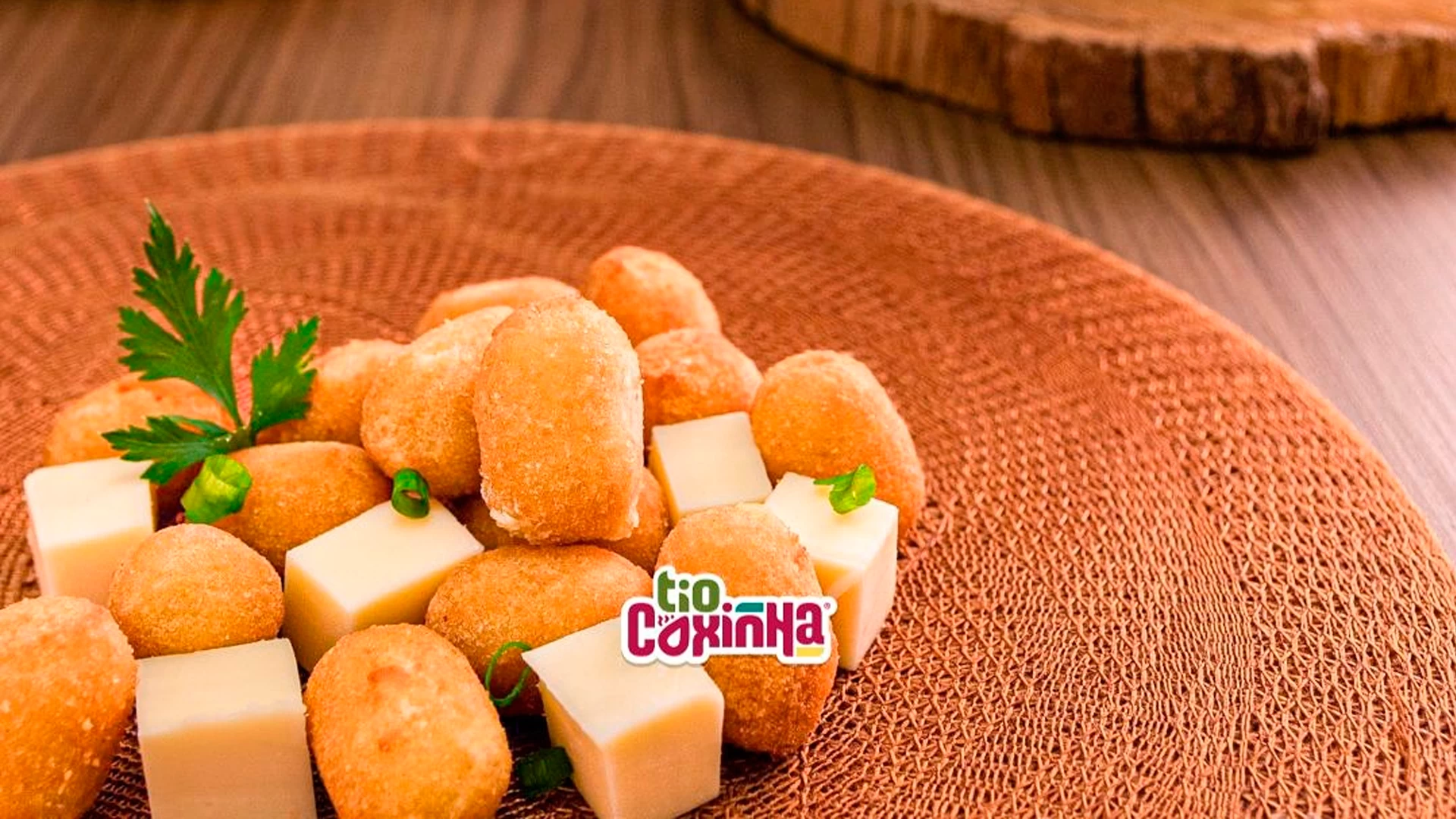 Bolinha de Queijo Crocante, massa leve e crocante, recheada com queijo derretido, que proporciona uma textura macia por dentro e uma casquinha crocante por fora.