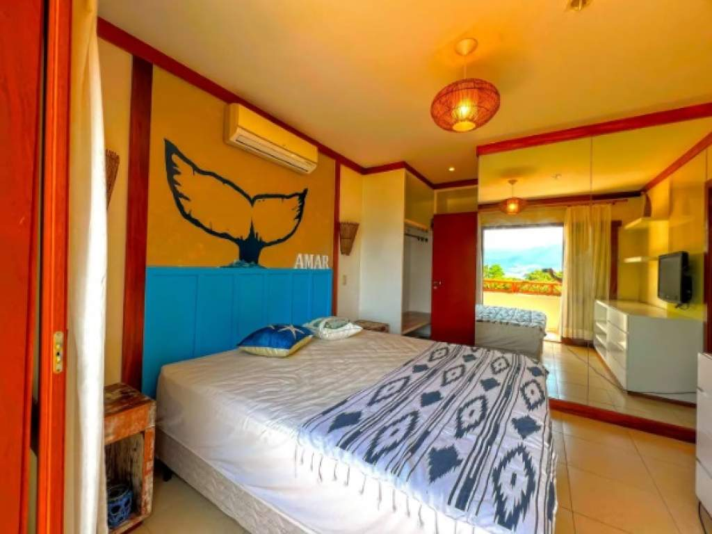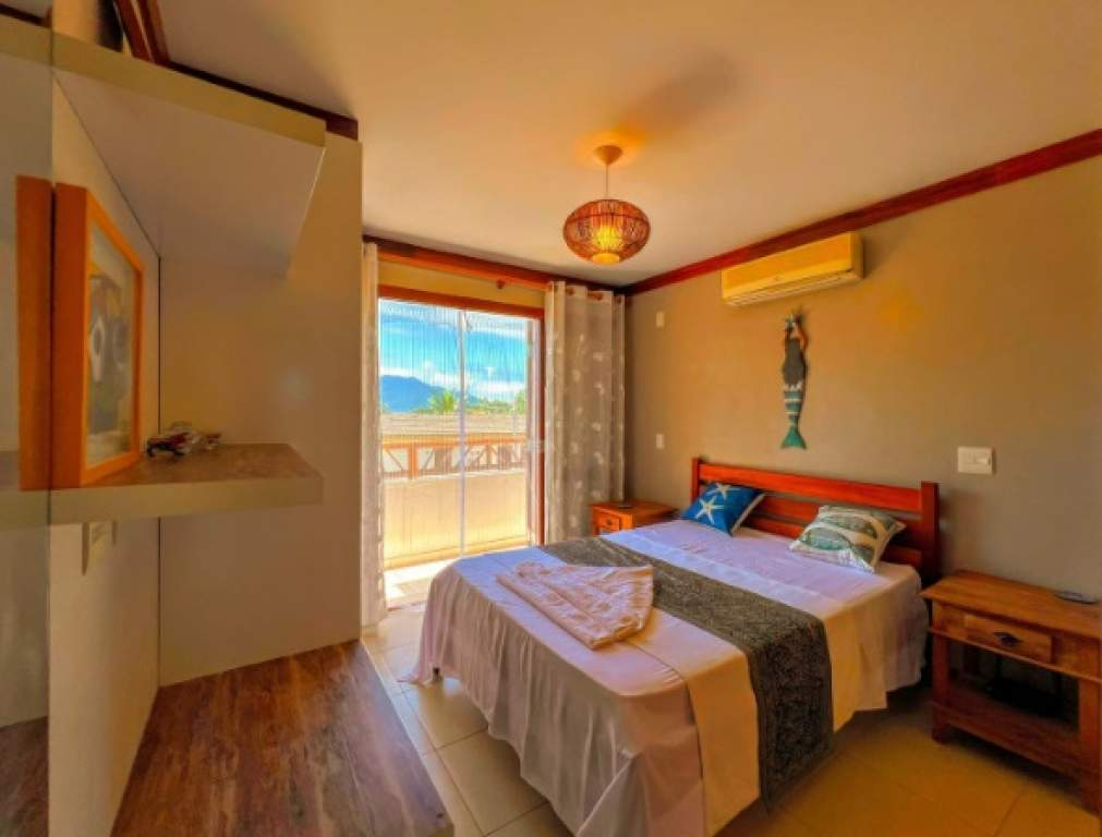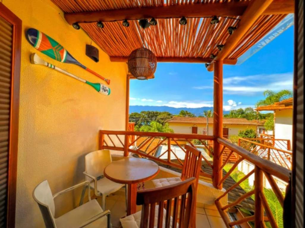 O bangalô é duplex, possui 2 suítes, a suíte master no andar superior, têm closet, banheiro com dois chuveiros e varanda. No andar inferior, possui uma suíte, varanda com mesa externa, sala e cozinha bem equipada. Todos os cômodos possuem vista para o mar.