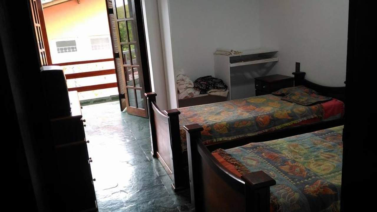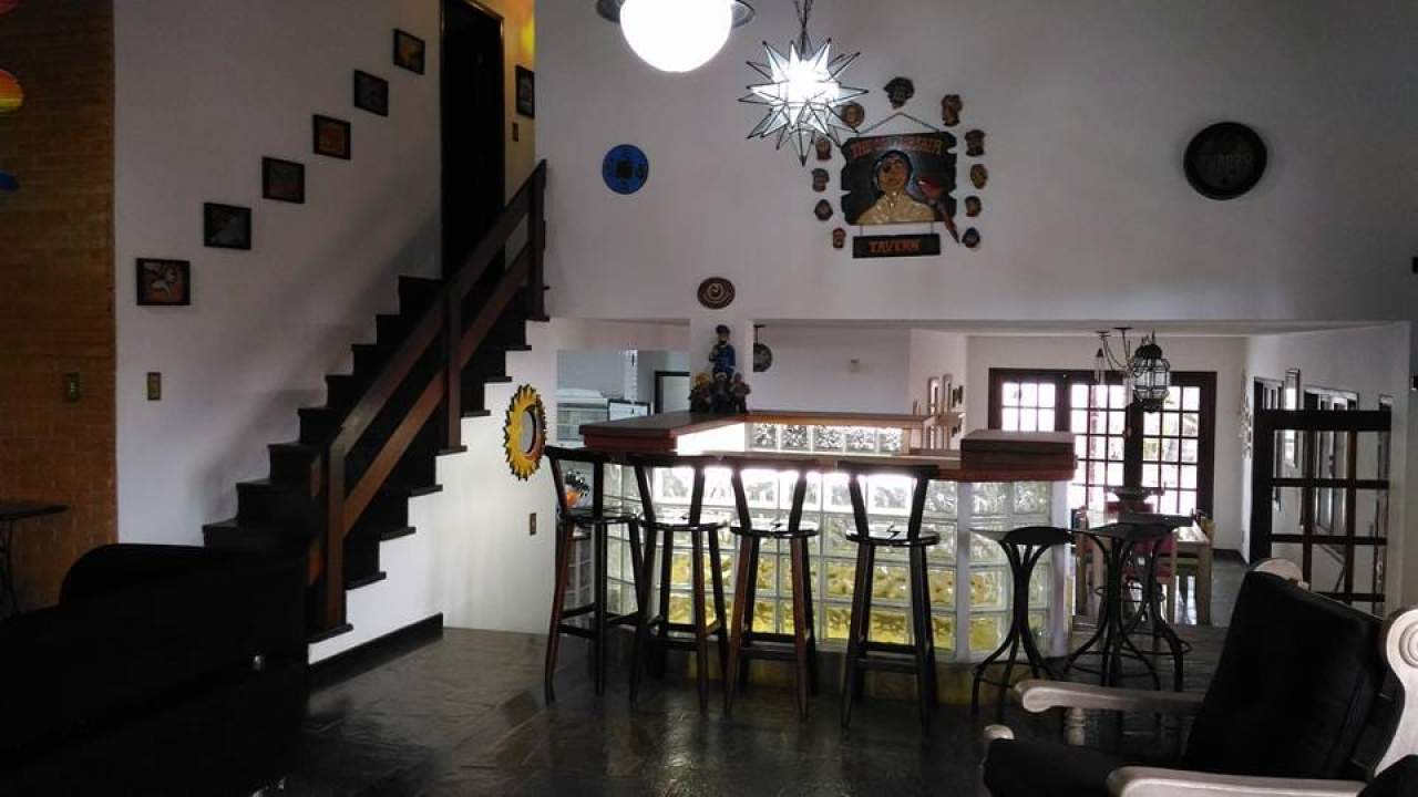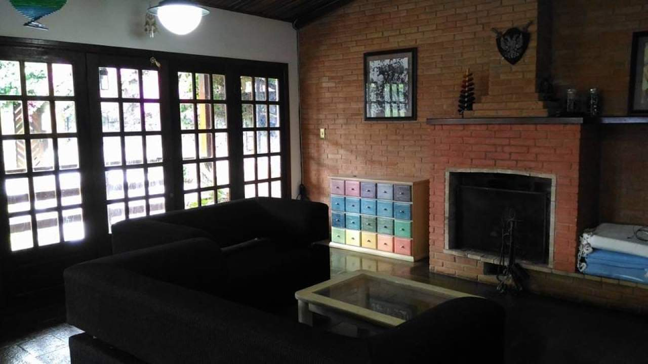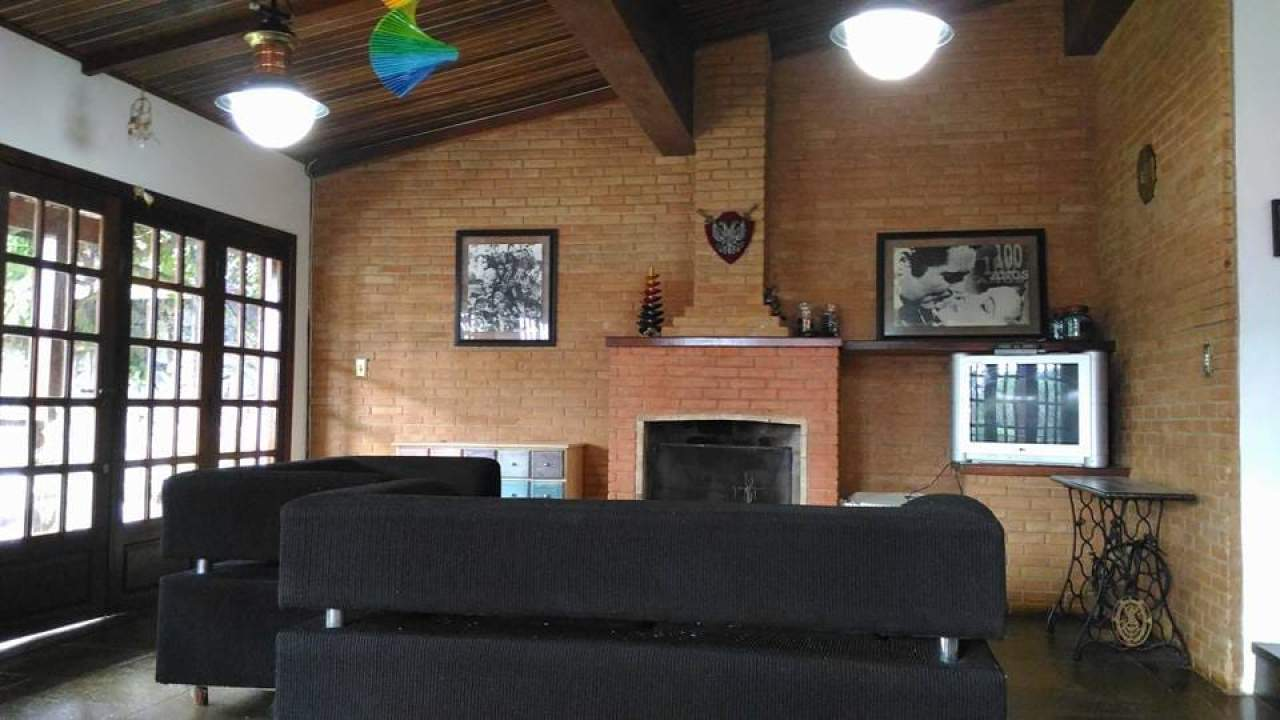 Casa com 4 dormitórios na parte superior. Sendo 2 suítes e 2 quartos com um banheiro. No andar superior 3 dormitórios com varanda. Andar inferior : sala ampla em desnível com lareira e sala de estar ampla com varanda , Sala de jantar com cozinha americana , portas de frente para piscina . Depósito, lavabo, lavanderia, quarto de empregada com banheiro. Mais um andar inferior: salão amplo (100 metros quadrados)que pode ser utilizado como área de Salão de jogos ou salão de festas . Área externa atrás da casa : piscina com cascata e Led. Banheiro. Churrasqueira ampla . Área verde com árvores frutíferas, que vão até a cachoeira. Está toda cercada com alambrando.