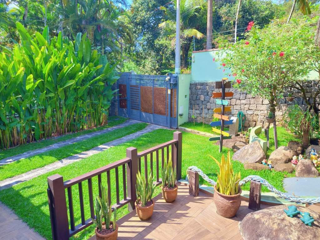 Amplos jardins com caminhos de pedras, árvores frutíferas e paisagismo tropical.