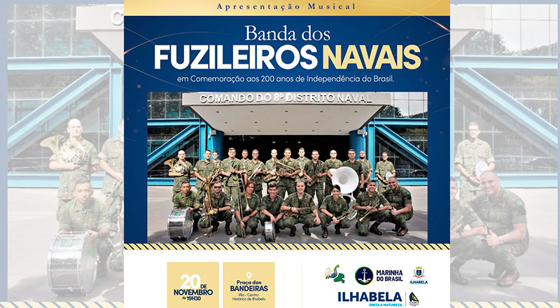 A Banda de Fuzileiros Navais do Oitavo Distrito Naval fará uma apresentação em Ilhabela no próximo sábado (20/11), a partir das 19h30, na Praça das Bandeiras, Vila, no Centro Histórico da cidade.