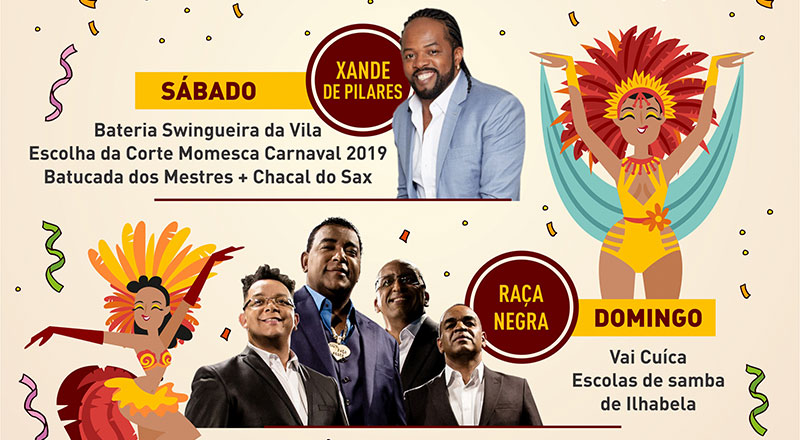 As atrações começam no sábado , às 19h, com bateria Swingueira da Vila e terminam às 23h30, com show do famoso cantor Xande de Pilares. No domingo, às 18h30, o evento iniciará com o projeto de São Paulo “Vai Cuíca” e encerrará com a apresentação da tradicional banda “Raça Negra”, às 22h30.
