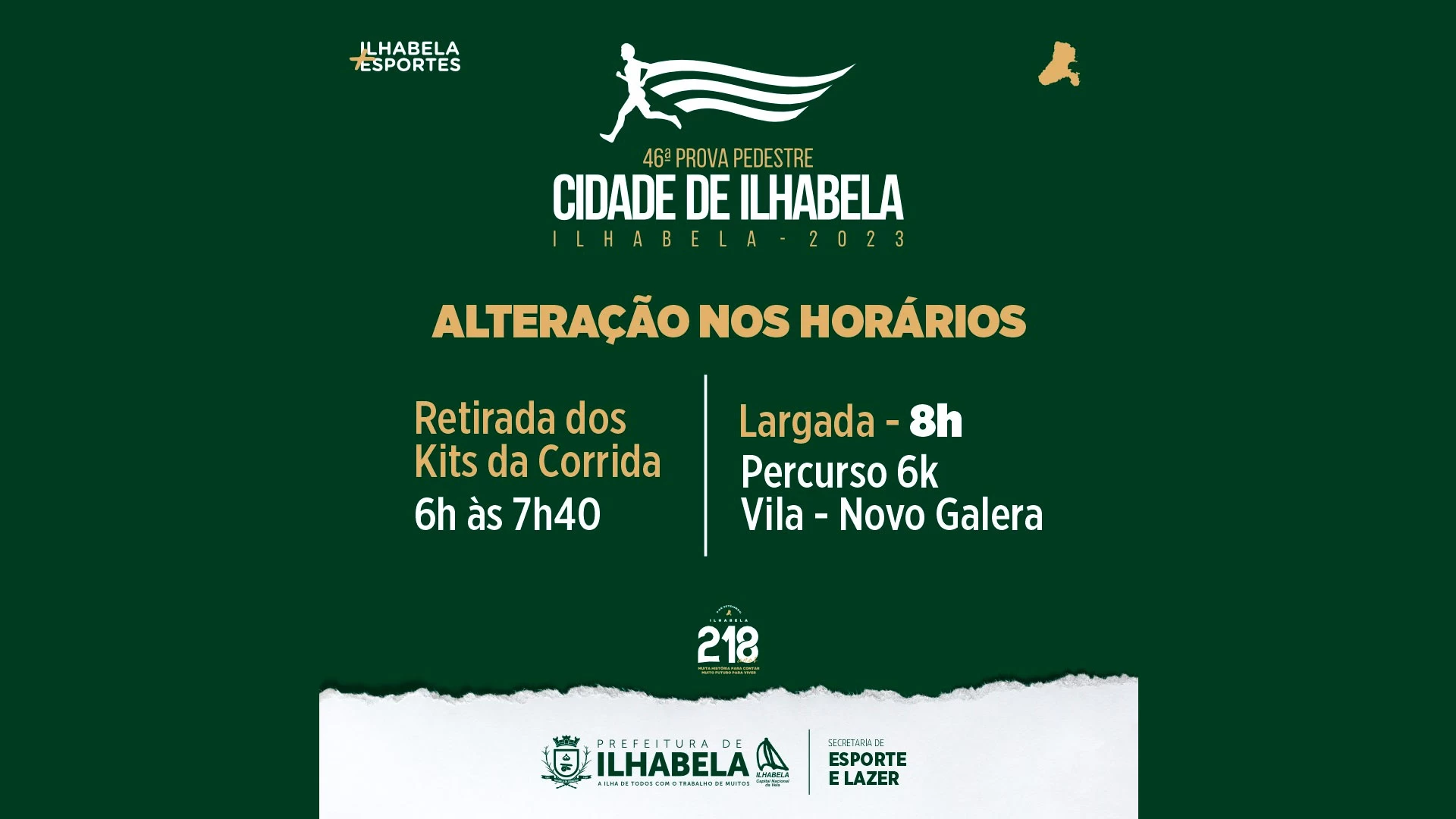 Teve alteração nos horários da 46ª Prova Pedestre "Cidade de Ilhabela". Agora, a retirada dos kits será das 6h às 7h40 e a largada às 8h na Vila.