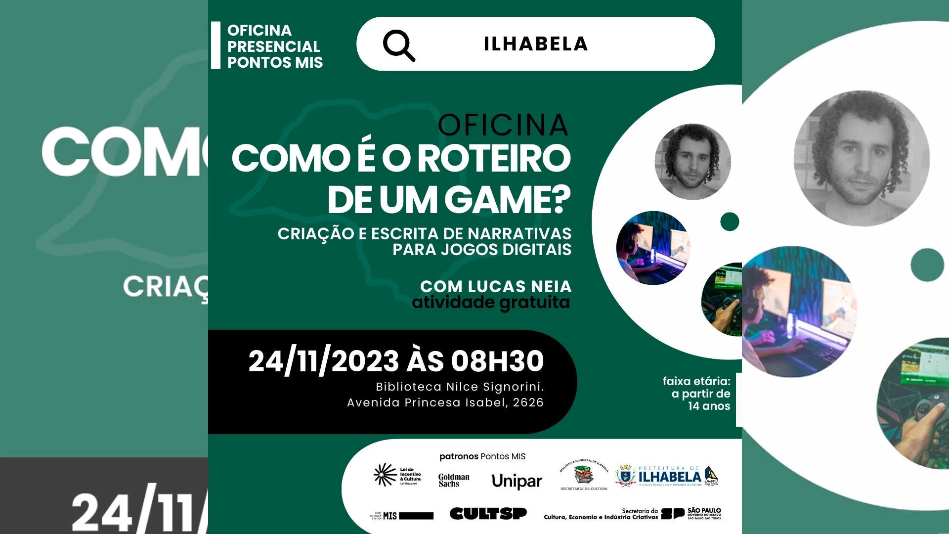 A Prefeitura de Ilhabela realiza mais uma oficina do Programa Pontos MIS na Biblioteca e Videoteca da Barra Velha - Nilce Signorini, “Como é o Roteiro de um Game? Criação e Escrita de Narrativas para Jogos Digitais", uma atividade inovadora para os entusiastas de jogos digitais, no próximo dia 24 de novembro de 2023, das 8h30 às 12h30.