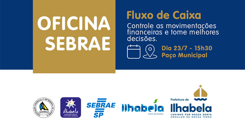 A Prefeitura de Ilhabela, por meio da Secretaria de Desenvolvimento Econômico e do Turismo e o Posto “Sebrae Aqui” de Ilhabela, realizará no dia 23 de julho, oficina gratuita “Fluxo de Caixa”, voltada aos empresários, microempresários e empreendedores locais. Os trabalhos terão início às 15h30, no auditório do Paço Municipal, no Perequê.