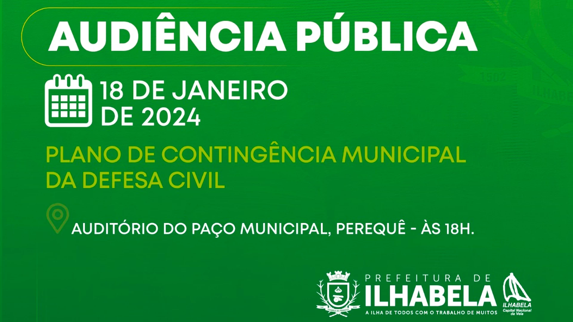 A Prefeitura de Ilhabela, por meio da Secretaria de Mobilidade e Segurança, realiza uma Audiência Pública para apresentar o Plano de Contingência Municipal da Defesa Civil no dia 18 de janeiro, no Auditório do Paço Municipal, às 18h.