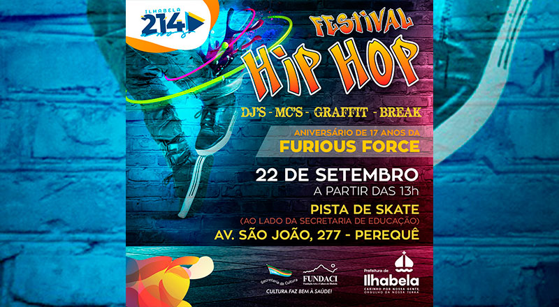 A Prefeitura de Ilhabela, por meio da Secretaria de Cultura e da Fundaci (Fundação Arte e Cultura de Ilhabela), preparou, para as comemorações do aniversário da cidade, o “Festival de Hip Hop”. Com muita dança e performances ousadas, o festival será no dia 22 de setembro, a partir das 13h, na pista de skate ao lado da Secretaria de Educação, no Perequê.
