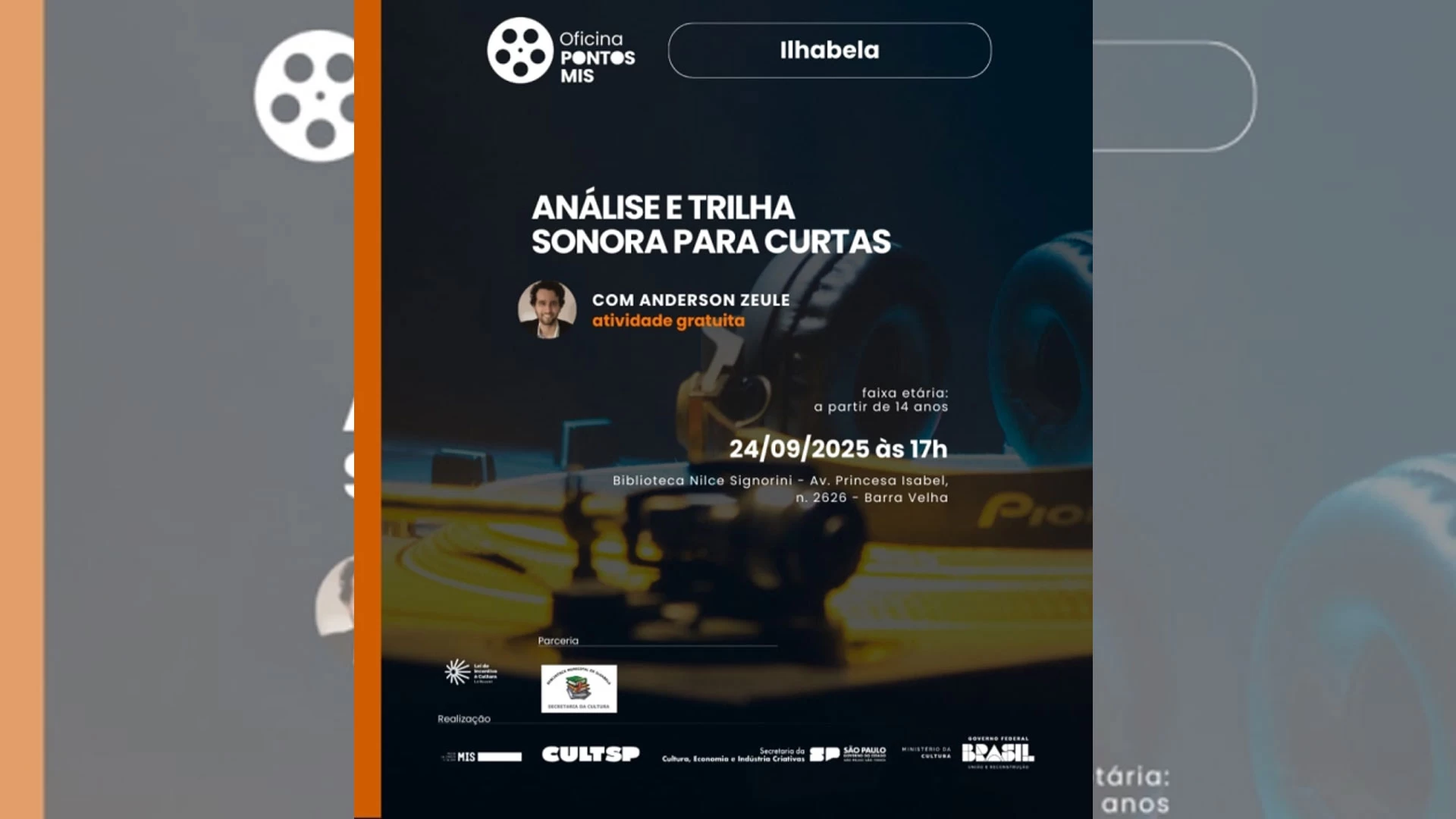 No dia 24 de setembro, às 17h, a Biblioteca Nilce Signorini receberá mais uma oficina gratuita, em parceria com o Pontos MIS. Voltada para adolescentes a partir de 14 anos e adultos interessados em cinema e música, “Análise e Trilha Sonora para Curtas” propõe uma experiência imersiva e interativa.