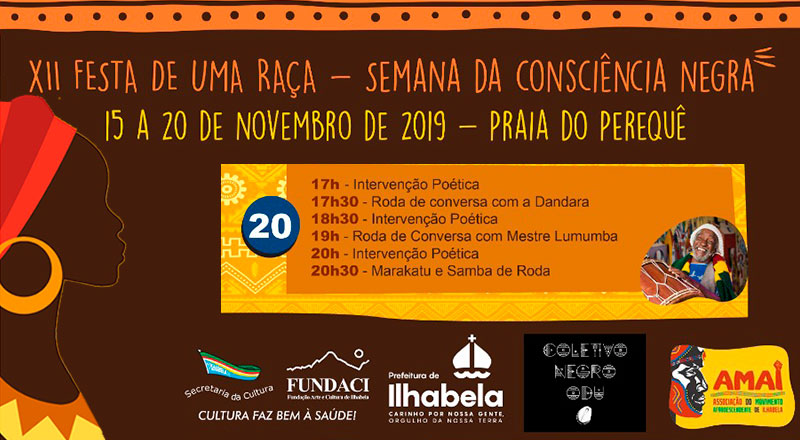 O Dia da Consciência Negra é comemorado em 20 de novembro em todo o país. A data homenageia o Zumbi dos Palmares, um escravo conhecido como líder do Quilombo dos Palmares. Em alusão à data, a Prefeitura de Ilhabela, por meio da Secretaria de Cultura, traz uma programação cultural especial em comemoração à data, para moradores e turistas, entre os dias 15 e 20 deste mês, na Praia do Perequê.