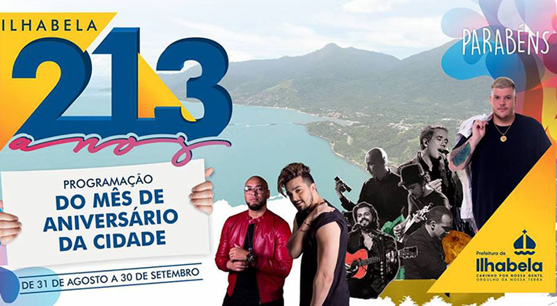 Com um mês repleto de eventos culturais e solenidades, Ilhabela completa mais um aniversário em setembro. Como já é tradicional, logo no início do mês serão feitos os shows musicais, de 31 a 03 de setembro, na Praça de Eventos e Lazer do Galera, no bairro Água Branca. Todas as noites, a partir das 20h, haverá a abertura com artistas da cidade e às 22h sobem ao palco as atrações principais.