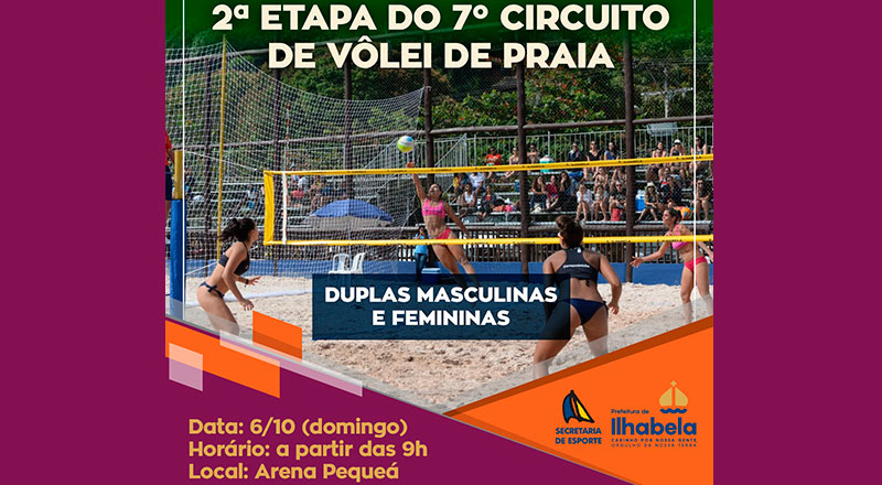 A Prefeitura de Ilhabela, por meio da Secretaria de Esporte e Lazer, realiza, no próximo domingo (6), a 2ª Etapa do 7º Circuito de Vôlei de Praia, na Arena Pequeá, a partir das 9h.