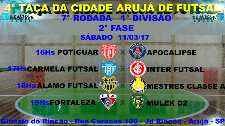 A última rodada da primeira fase da 2ª Divisão e a disputa entre os times da elite na busca pela classificação para as semifinais da Taça Arujá de Futsal 2017 prometem agitar o fim de semana. As partidas serão no Ginásio Municipal de Esportes Antônio Carlos Mendonça.