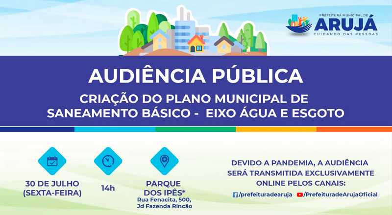 Nesta sexta-feira (30), às 14 horas, acontece a Audiência Pública sobre a Criação do Plano Municipal de Saneamento Básico - Eixo Água e Esgoto. Devido à pandemia, a audiência será transmitida exclusivamente online pelos canais oficiais do Facebook e Youtube da Prefeitura de Arujá. O plano já está disponível para consulta da população no site da Prefeitura, no link: https://www.prefeituradearuja.sp.gov.br/arquivos/Minuta%20final%20do%20Plano%20Municipal%20de%20Saneamento%20B%C3%A1sico%20-%20Eixo%20Agua%20e%20esgoto.pdf