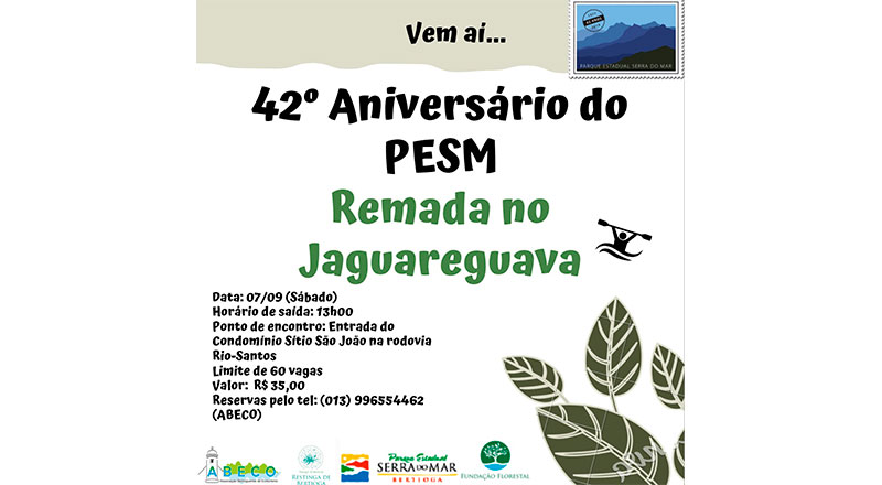 No próximo dia 30 de agosto, o PESM (Parque Estadual Serra do Mar) completa 42 anos de fundação. Para comemorar a data, haverá a “Remada no Rio Jaguareguava”. O evento acontece dia 07 de setembro, das 13 às 16h30, com encontro na entrada do Condomínio Sítio São João, localizado na rodovia Rio-Santos, logo após a ponte do Rio Itapanhaú, sentido Bertioga – Guarujá. O evento conta com apoio da Prefeitura.