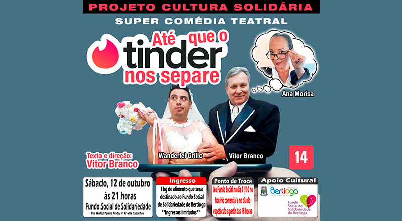 Neste sábado (12), a partir das 21 horas, o Fundo Social de Solidariedade de Bertioga recebe o espetáculo teatral “Até que o Tinder nos separe”, inspirado no filme “Eu os declaro marido e Larry”. É preciso trocar o ingresso por 1 kg de alimento não perecível. A troca acontece na sexta (11), em horário comercial, ou no dia do espetáculo, a partir das 18 horas. A classificação indicativa é de 14 anos.