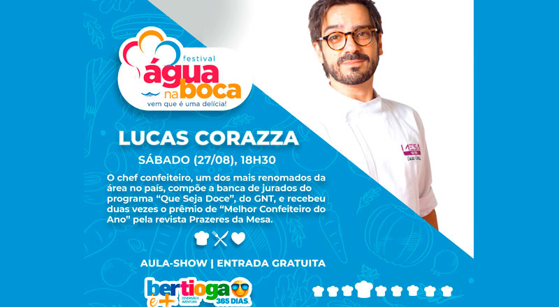 Lucas Corazza também desembarcará em Bertioga, com o melhor da confeitaria. O chef, um dos mais renomados da área no país, compõe a banca de jurados do programa “Que Seja Doce”, do GNT, e já recebeu duas vezes o prêmio de Melhor Confeiteiro do Ano pela revista Prazeres da Mesa.