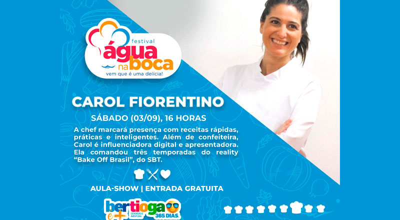 Chefs renomados, como Carole Crema, Lucas Corazza, Dalton Rangel e Carol Fiorentino darão um show de culinária ao vivo para os visitantes durante o Festival Água na Boca, em Bertioga. O evento acontecerá de 26 de agosto a 04 de setembro, sempre aos finais de semana, no Parque dos Tupiniquins, reunindo o melhor da gastronomia regional e mundial.
