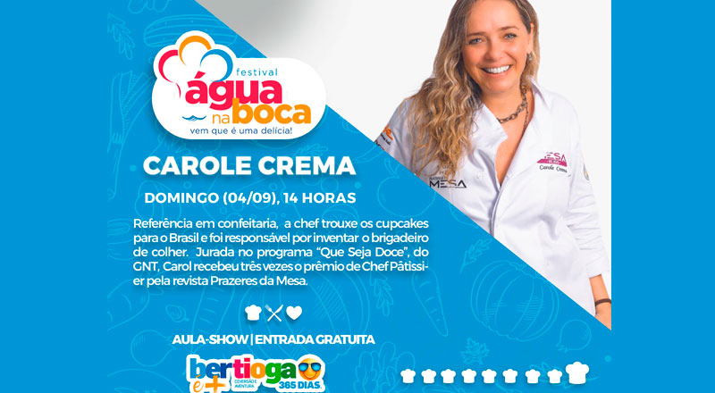 Chefs renomados, como Carole Crema, Lucas Corazza, Dalton Rangel e Carol Fiorentino darão um show de culinária ao vivo para os visitantes durante o Festival Água na Boca, em Bertioga. O evento acontecerá de 26 de agosto a 04 de setembro, sempre aos finais de semana, no Parque dos Tupiniquins, reunindo o melhor da gastronomia regional e mundial.