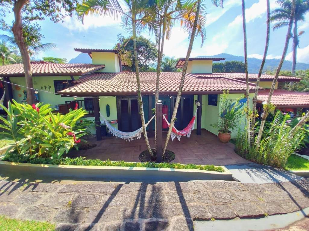 Amplos jardins com caminhos de pedras, árvores frutíferas e paisagismo tropical.