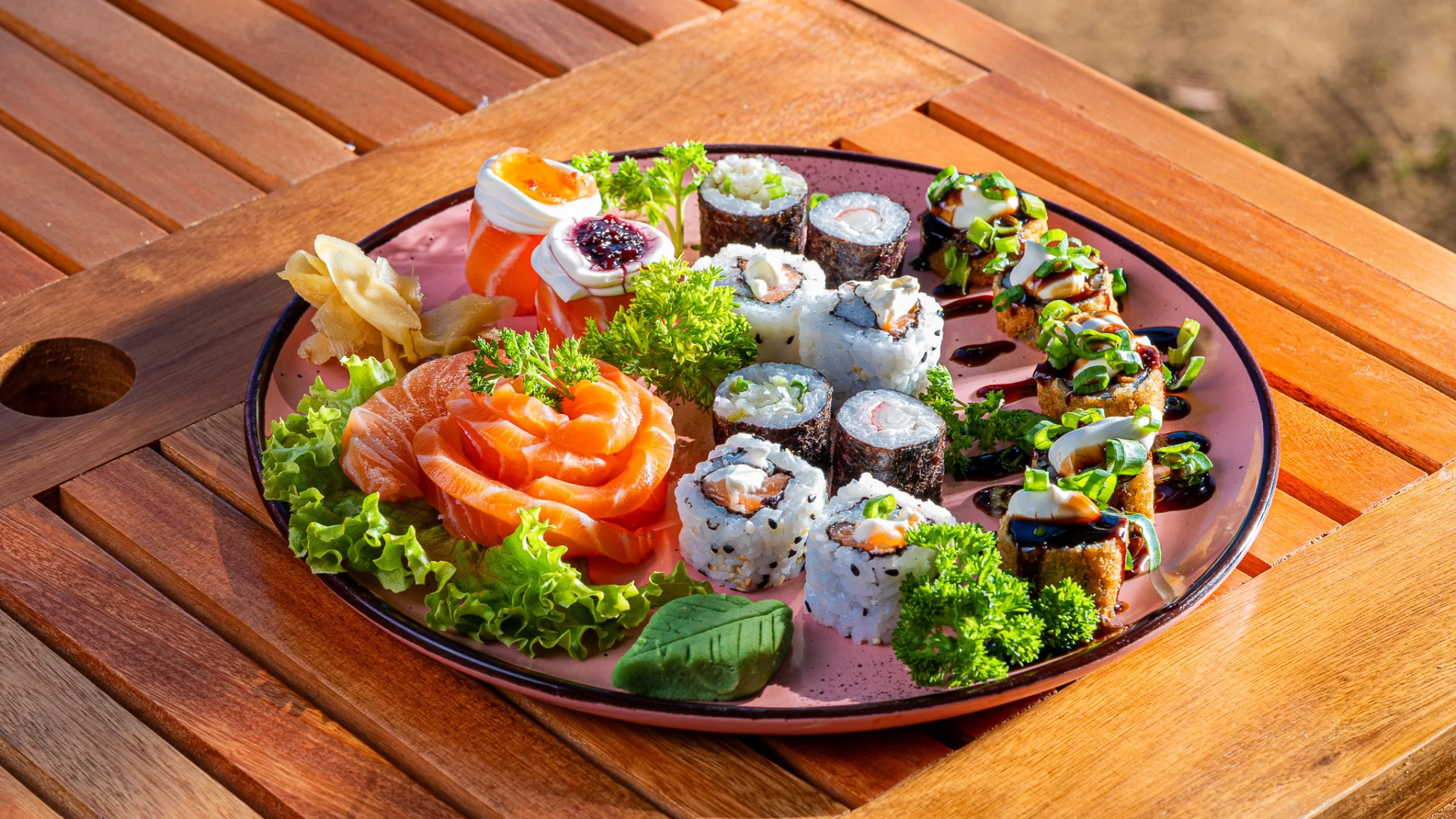 5 sashimis de salmão, 4 hossomakis variados, 4 urumakis variados, 5 hot rolls, 2 gunkans joy