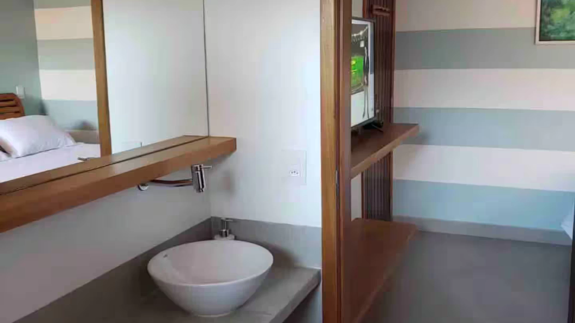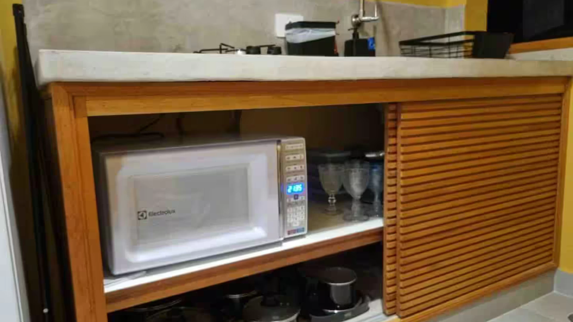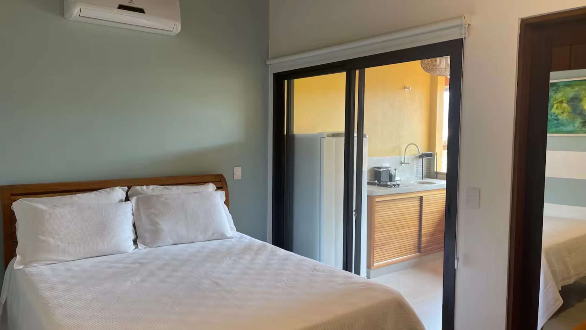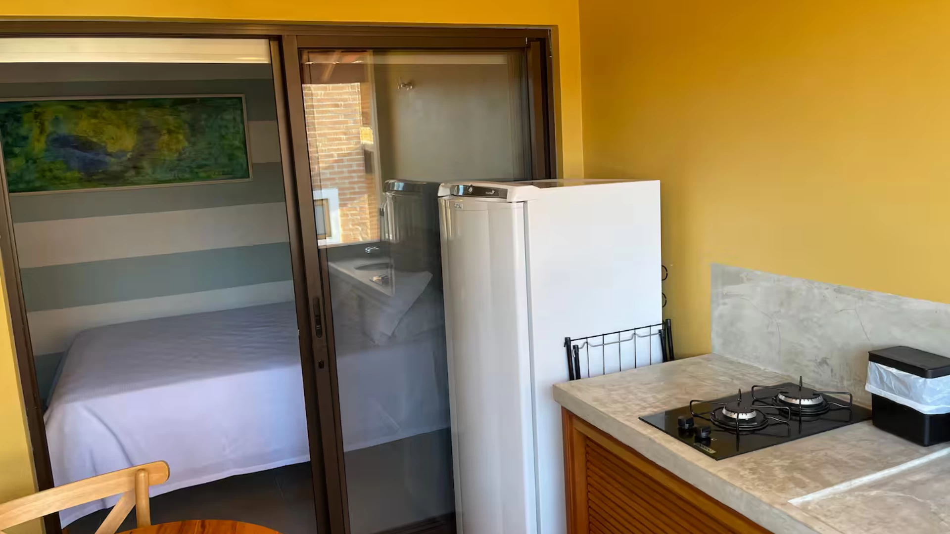 Relaxe neste lugar único e tranquilo. Apto c/cama Queen, cortina blackout, roupas de cama e banho, ar cond, ventilador de teto, smart tv, varanda com geladeira, cooktop, microondas e muitos utensílios para o preparo de refeições. Não é permitido uso de churrasqueira portátil