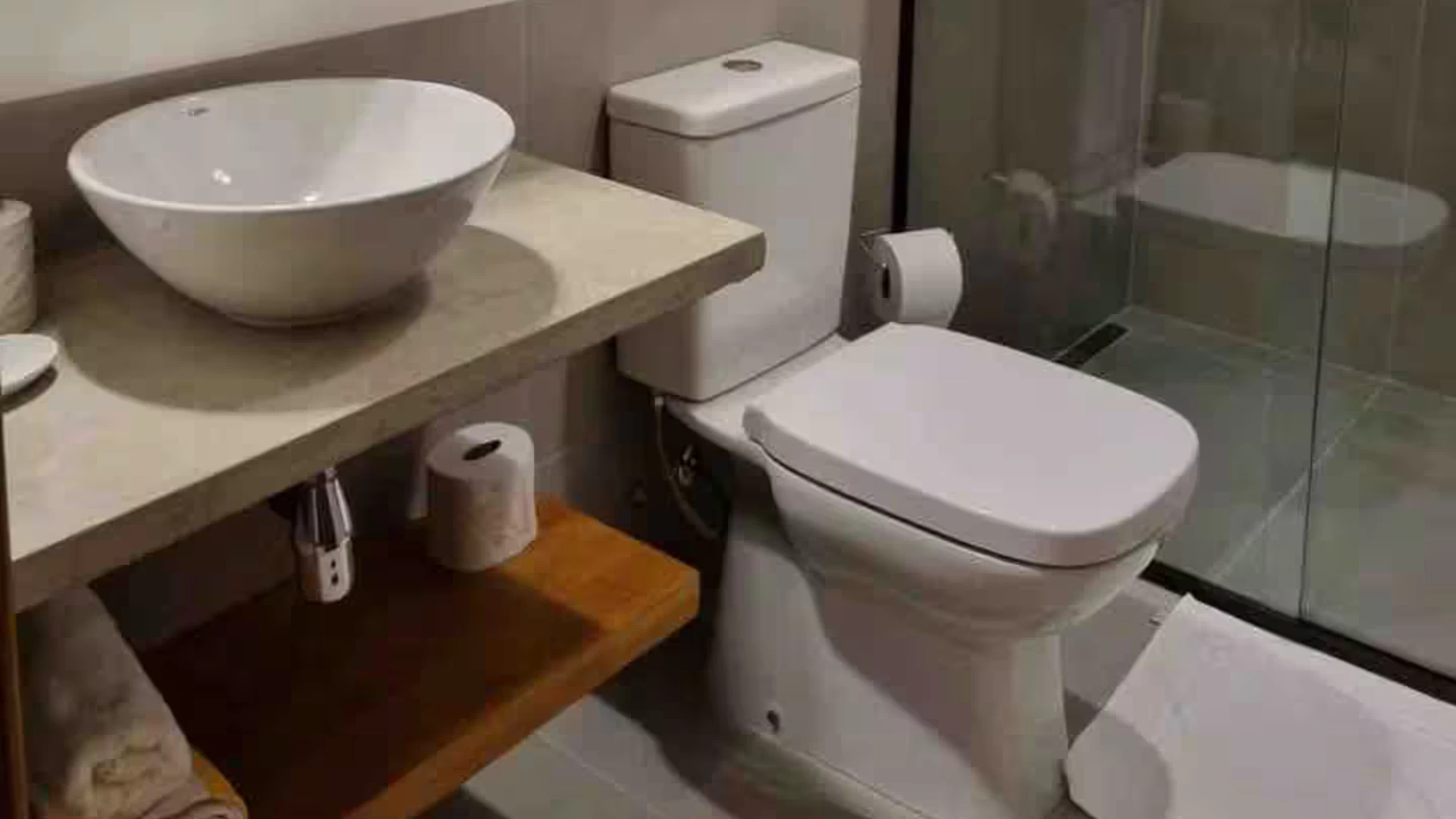 Banheiro confortável com secador de cabelo, roupa de banho e chuveiro elétrico