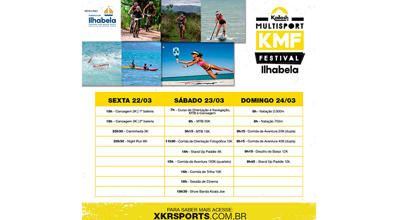 Ilhabela se prepara para receber, de 22 a 24 de março, com sede na Praia do Perequê, o Festival KMF que, segundo a organização, é o maior evento multiesportivo do Brasil. A disputa reunirá, nos três dias, as mais variadas modalidades, como corrida em montanha, corrida de rua, corrida de orientação, de aventura, SUP, canoagem, mountain bike, natação em águas abertas e beach tennis.