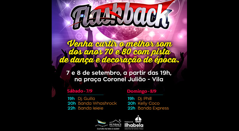 Na programação dos embalos de sábado à noite em Ilhabela terá pista de dança, decoração de época, músicas que ficaram marcadas nas décadas de 70 a 80, tudo isso no “Baile do Flashback”, promovido pela prefeitura, por meio da Secretaria de Cultura e da Fundaci, marcado para os dias 7 e 8 de setembro.