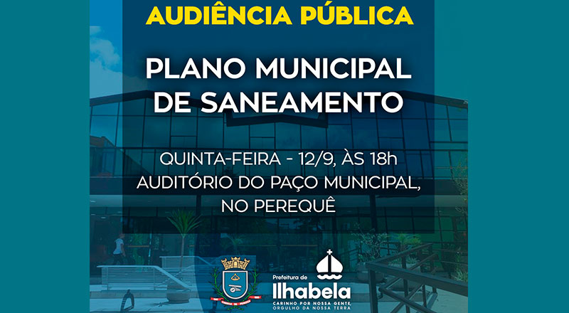 A Prefeitura de Ilhabela, por meio da Secretaria de Meio Ambiente, convida para audiência pública de apresentação do Plano Municipal de Saneamento Básico, a ser realizada nesta quinta-feira (12), a partir das 18h, no auditório do Paço Municipal, no Perequê.