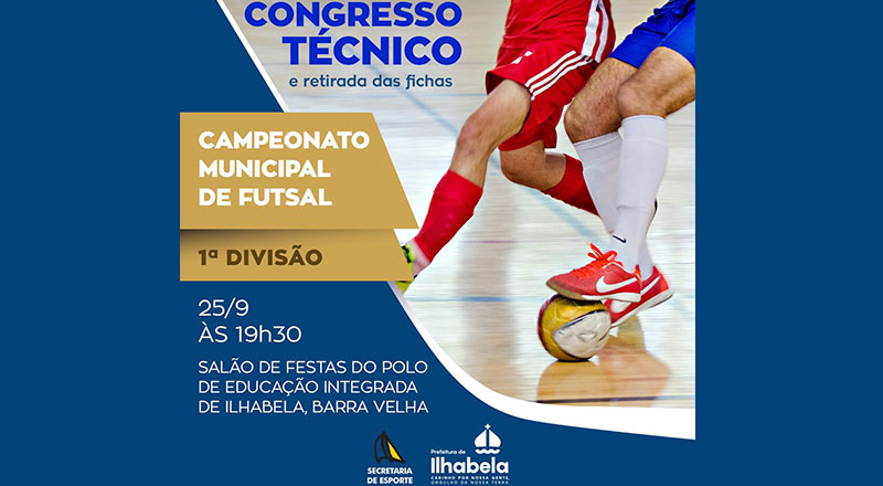 O Congresso Técnico da 1ª Divisão será realizado no próximo dia 25, às 19h30, no salão de festas do Polo de Educação Integrada de Ilhabela, na Barra Velha. Na ocasião, serão repassados informações e detalhes sobre o formato do campeonato, bem como distribuídas as fichas de inscrições.