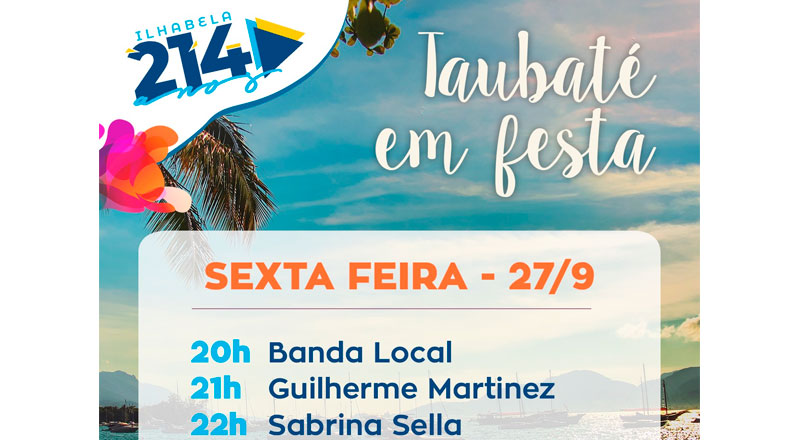 A Prefeitura de Ilhabela, por meio da Secretaria de Cultura e da Fundação Arte e Cultura de Ilhabela (Fundaci), promove, nesta sexta-feira (27) e sábado (28), no bairro do Taubaté e na praia da Pedra do Sino, na região Norte, programação repleta de cultura e lazer, ainda em comemoração aos 214 anos de Emancipação Político-Administrativa da cidade.