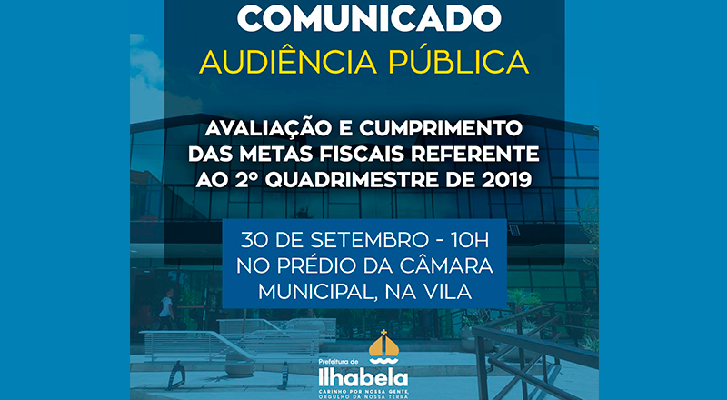 A Prefeitura de Ilhabela, por meio da Secretaria de Gestão Financeira, em parceria com o Poder Legislativo Municipal, realizará, na próxima segunda-feira (30), a audiência pública de Avaliação e Cumprimento das Metas Fiscais referente ao 2º quadrimestre de 2019. Os trabalhos começam às 10h, no prédio da Câmara Municipal, na Vila.