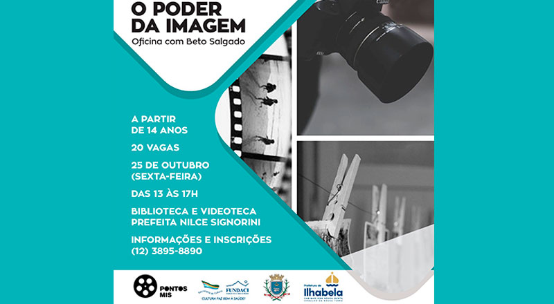 A Prefeitura de Ilhabela, por meio da Secretaria de Cultura, realiza, no dia 25 deste mês, a oficina “O Poder da Imagem”, com Beto Salgado, das 13h às 17h, no prédio da Biblioteca e Videoteca Prefeita Nilce Signorini, na Barra Velha.