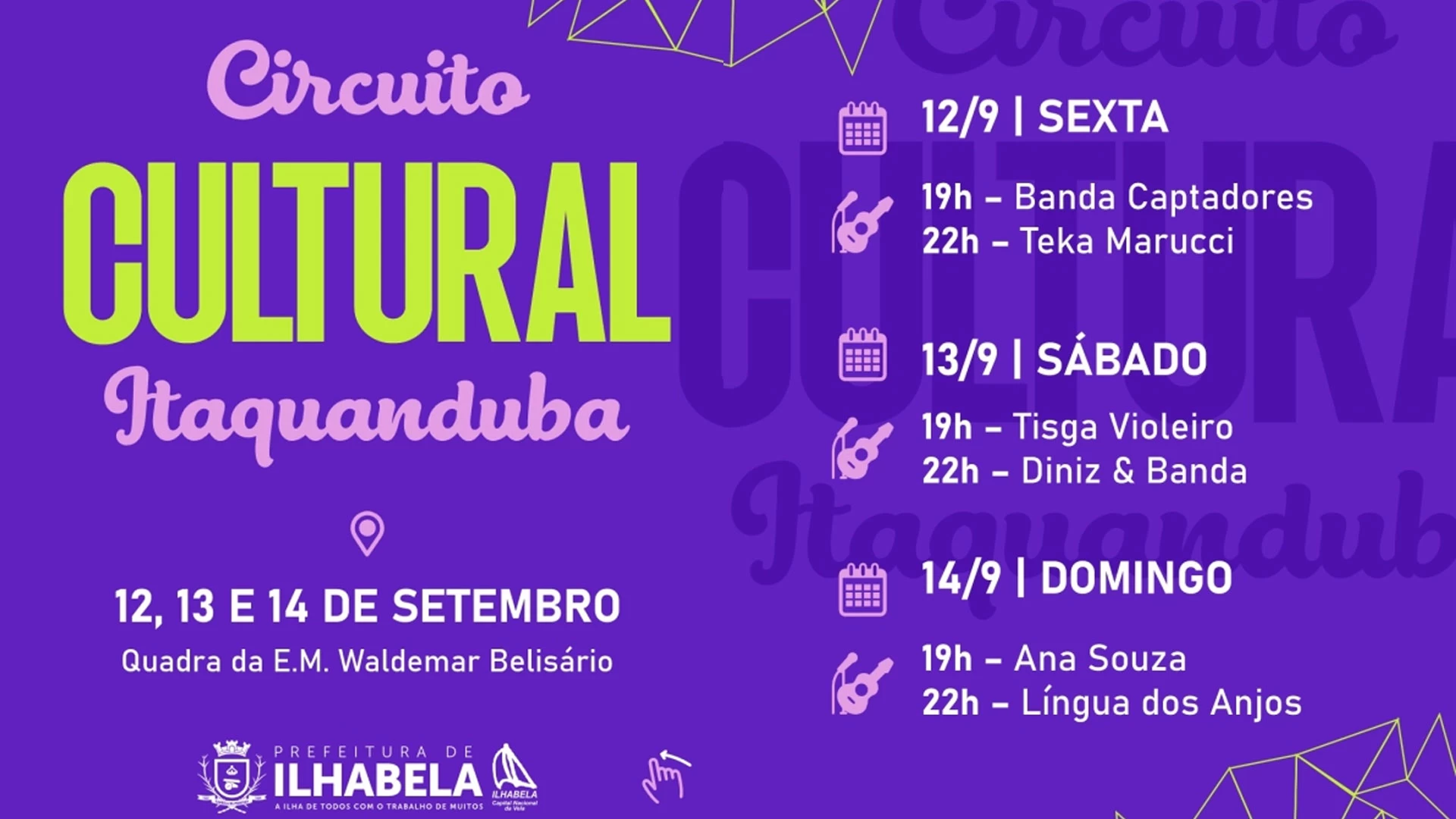 A quadra da Escola Municipal Waldemar Belisário, no bairro do Itaquanduba, será palco de mais uma edição do Circuito Cultural de Ilhabela. O evento ocorrerá entre os dias 12 e 14 de setembro, a partir das 19h, com entrada gratuita.