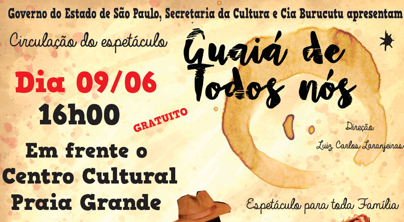 A Prefeitura de Ilhabela, por meio da Secretaria de Cultura, e o Proarc (Programa de Ação Cultural), apresenta neste sábado (9), às 16h, em frente ao Centro Cultural da Praia Grande, o espetáculo “Guaiá de todos nós”. A peça está em circulação pelo Litoral Paulista e Vale do Ribeira, encenado pela Cia Burucutu.