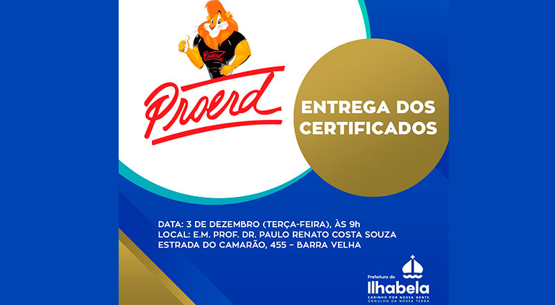 A Prefeitura de Ilhabela, por meio da Secretaria de Educação em parceria com Polícia Militar, realizará a cerimônia de formatura do Programa Educacional de Resistência às Drogas (Proerd), no dia 3 de dezembro, às 9h, na E.M. Paulo Renato Costa Souza, na Estrada do Camarão – Barra Velha. No local, serão entregues os certificados aos 253 alunos da rede municipal de ensino.