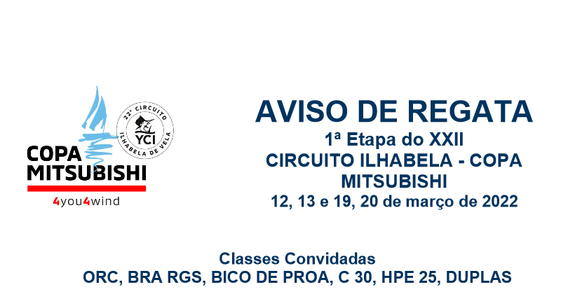 O YCI convida os velejadores de oceano das classes ORC, BRA RGS, BICO DE PROA, C 30, HPE 25, DUPLAS para participarem da 1ª Etapa da XXII Copa Mitsubishi – Circuito Ilhabela de Vela, nos dias 12, 13 e 19, 20 de março de 2022.