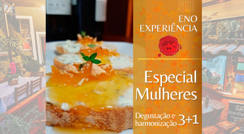 Como sempre, três rótulos harmonizados especialmente para ocasião, porém, PARA AS MULHERES teremos uma quarta experiência com um espumante Moscatel e uma bruschetta de creme Azul da Mantiqueira com calda de damasco e castanha de caju, uma harmonização deliciosa para fechar o momento com chave de ouro!