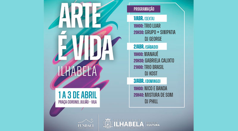A Praça Coronel Julião, na Vila, recebe neste final de semana, 1, 2 e 3 de Abril, a programação musical do projeto Arte é Vida, da Fundação Arte e Cultura de Ilhabela - Secretaria de Cultura, a partir das 19h.