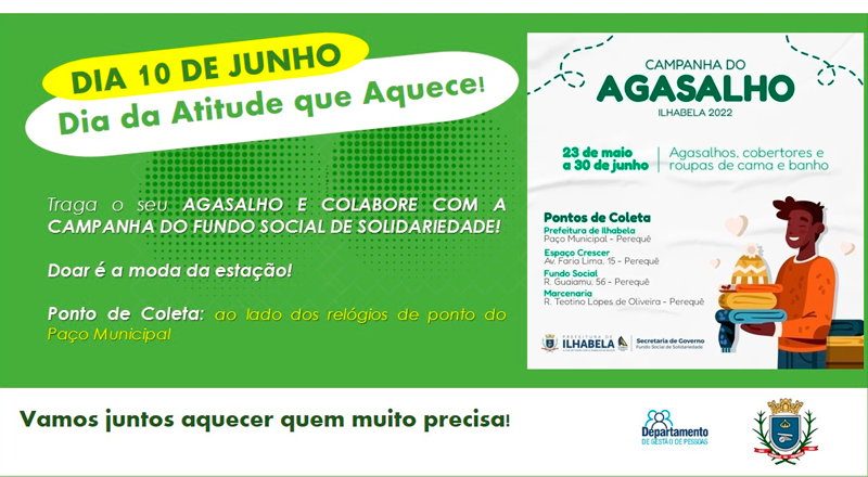 No intuito de ajudar e promover a Campanha do Agasalho 2022, o Departamento de Gestão de Pessoas (DPG) da Prefeitura de Ilhabela, realiza nesta sexta-feira (10/6) o “Dia da Atitude que Aquece”.