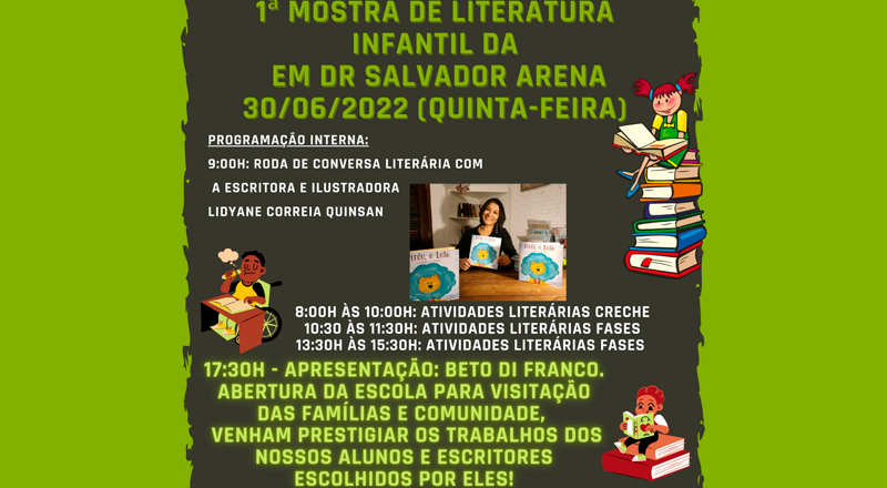 Ainda na programação interna da I Mostra de Literatura Infantil, da E.M. Salvador Arena terá as atividades literárias da creche (das 8h às 10h) e as atividades literárias das fases (das 10h30 às 11h30 e das 13h30 às 15h30).
