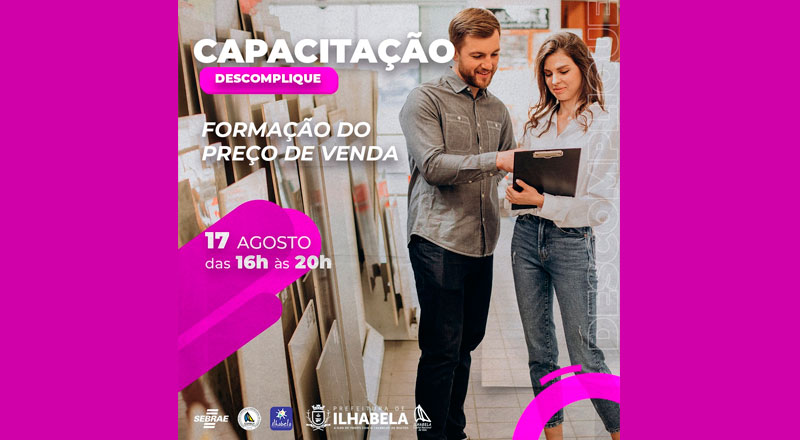 A Prefeitura de Ilhabela em nova parceria com o Sebrae, abriu vagas para o Curso Descomplique – Formação de Preço de Venda, que será realizado no dia 17 de agosto no auditório da Secretaria de Turismo na Barra Velha.
