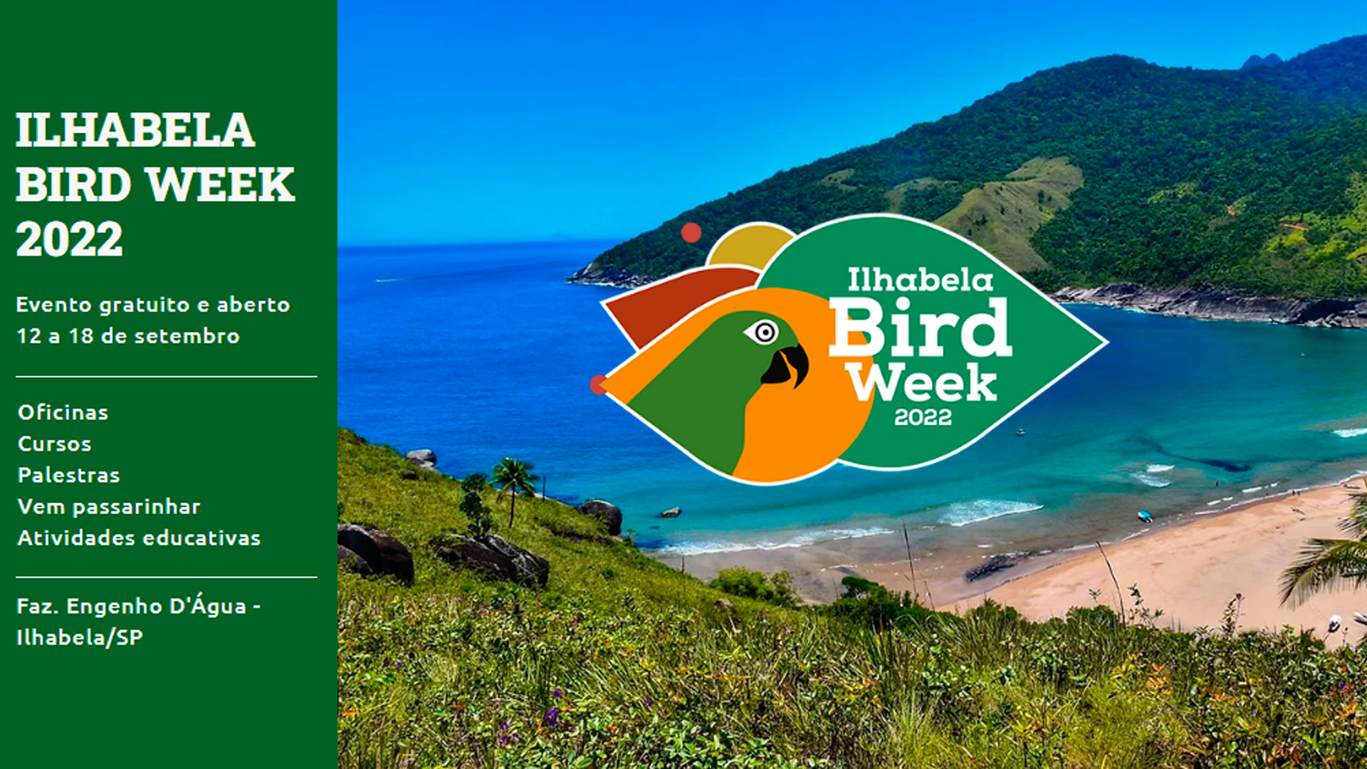 A Prefeitura de Ilhabela promove a partir do dia 12 de setembro mais uma edição do “Ilhabela Bird Week”. O evento conta com exposições fotográficas, oficinas nas escolas, passarinhadas e palestras. A programação segue até o dia 18 de setembro e visa fortalecer a cidade como destino de observação de aves e integra as festividades do aniversário de 217 anos de Emancipação Político-Administrativa de Ilhabela e os 200 anos da Independência do Brasil.