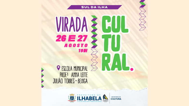 A Prefeitura de Ilhabela, por meio da Secretaria de Cultura, promove nesta sexta-feira e sábado (26 e 27/8) a Virada Cultural, no bairro do Bexiga, região sul da cidade. O evento será realizado na Escola Municipal Prof.ª Anna Leite Julião Torres, com diversas atrações musicais.