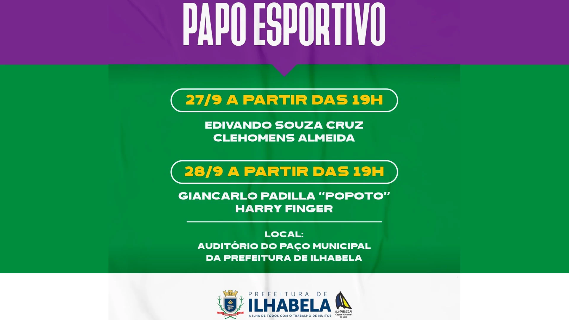 A Prefeitura de Ilhabela por meio da Secretaria de Esportes e Lazer, promove nos dias 27 e 28 de setembro, o "Papo Esportivo", com diversas palestras sobre esportes, no auditório do Paço Municipal da Prefeitura de Ilhabela, a partir das 19h.