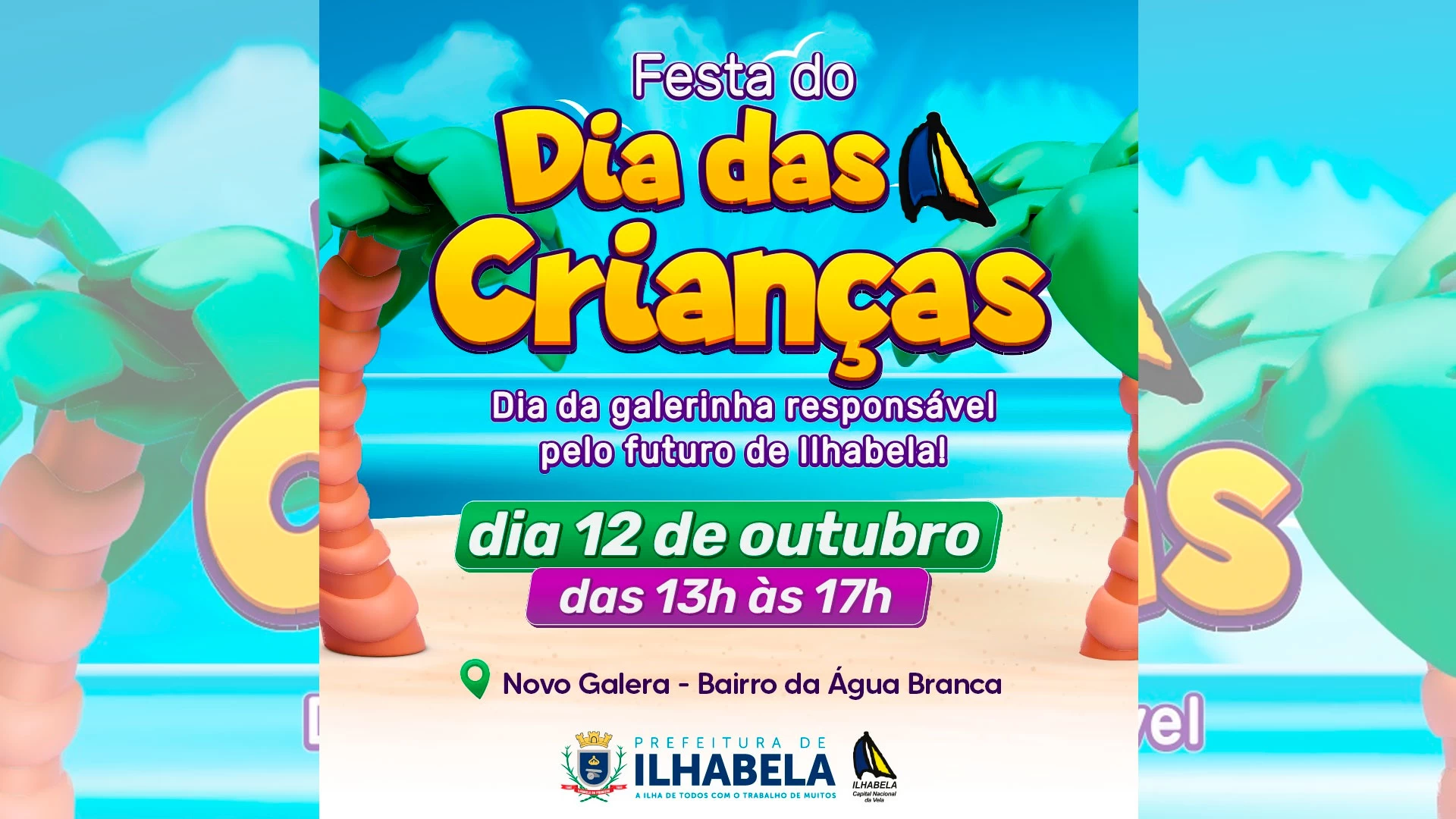 A Prefeitura de Ilhabela organizou uma festa muito especial em comemoração ao Dia da Criança, na próxima quarta-feira, 12 de outubro, das 13h às 17h, no Novo Galera (Água Branca) e que terá como atração principal Patati Patatá, prevista para às 15h.