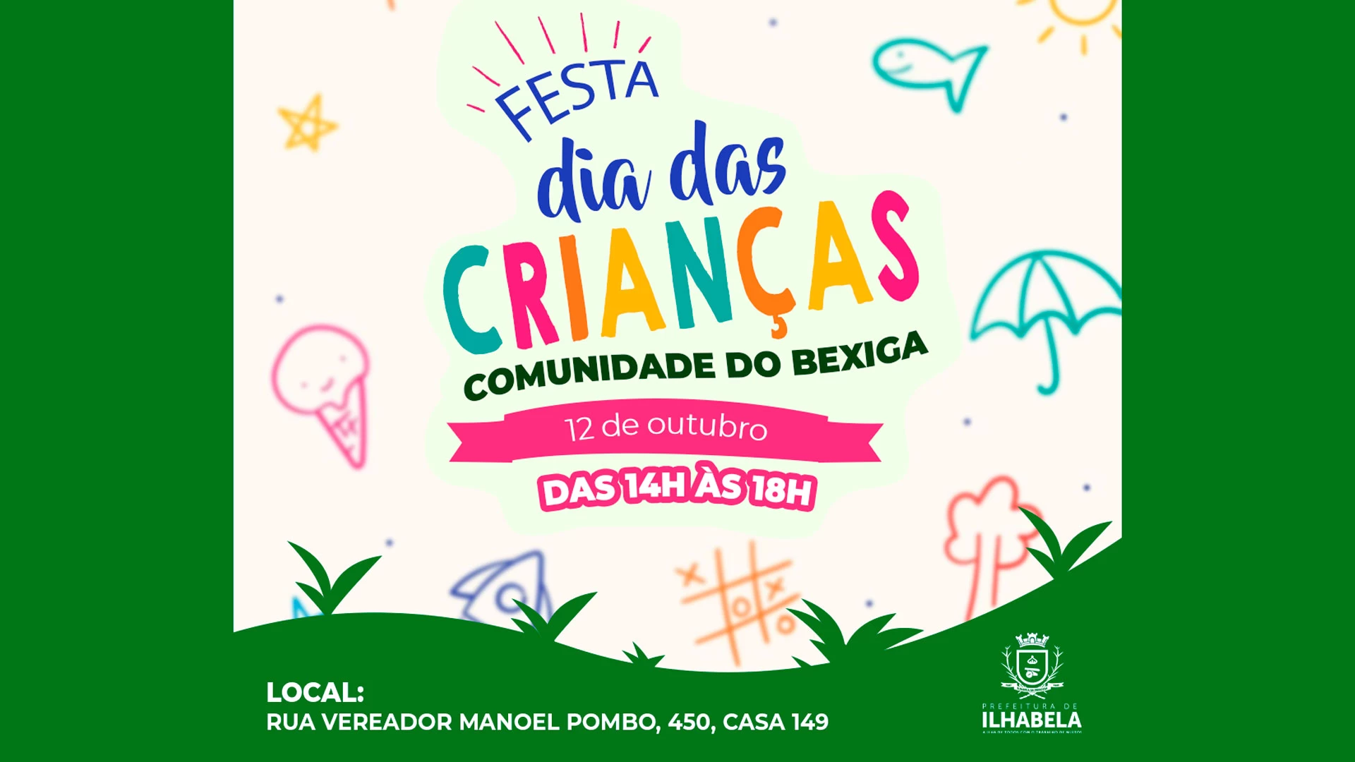 A Prefeitura de Ilhabela, por meio da Secretaria de Desenvolvimento e Inclusão Social, promove apoio à festa de dia das crianças que tem sido realizada de maneira voluntária há seis anos pela senhora Alaíde dos Santos e pelo senhor Davidson de Souza dos Santos (falecido em julho de 2021), no bairro do Bexiga das 14h às 18h.